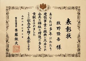 令和6年7月10日、国土交通省において行われた表彰式において「多年地質調査業に精励するとともに関係団体の役員として業界の発展に寄与した」として表彰されました。これもひとえに事業上関係のある皆様方からのお力添えによるものと深く感謝しております。今後も事業に愚直に取り組むことを通じて地域社会の発展に貢献して参る所存であります。この度は誠にありがとうございます。